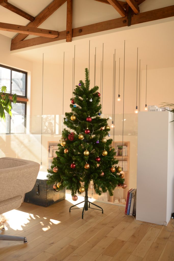 段取り良くうまく午前中でお仕事が出来たので、お昼休憩の時間を利用してクリスマスツリーを、今年は2階のギャラリースペースに飾りました。