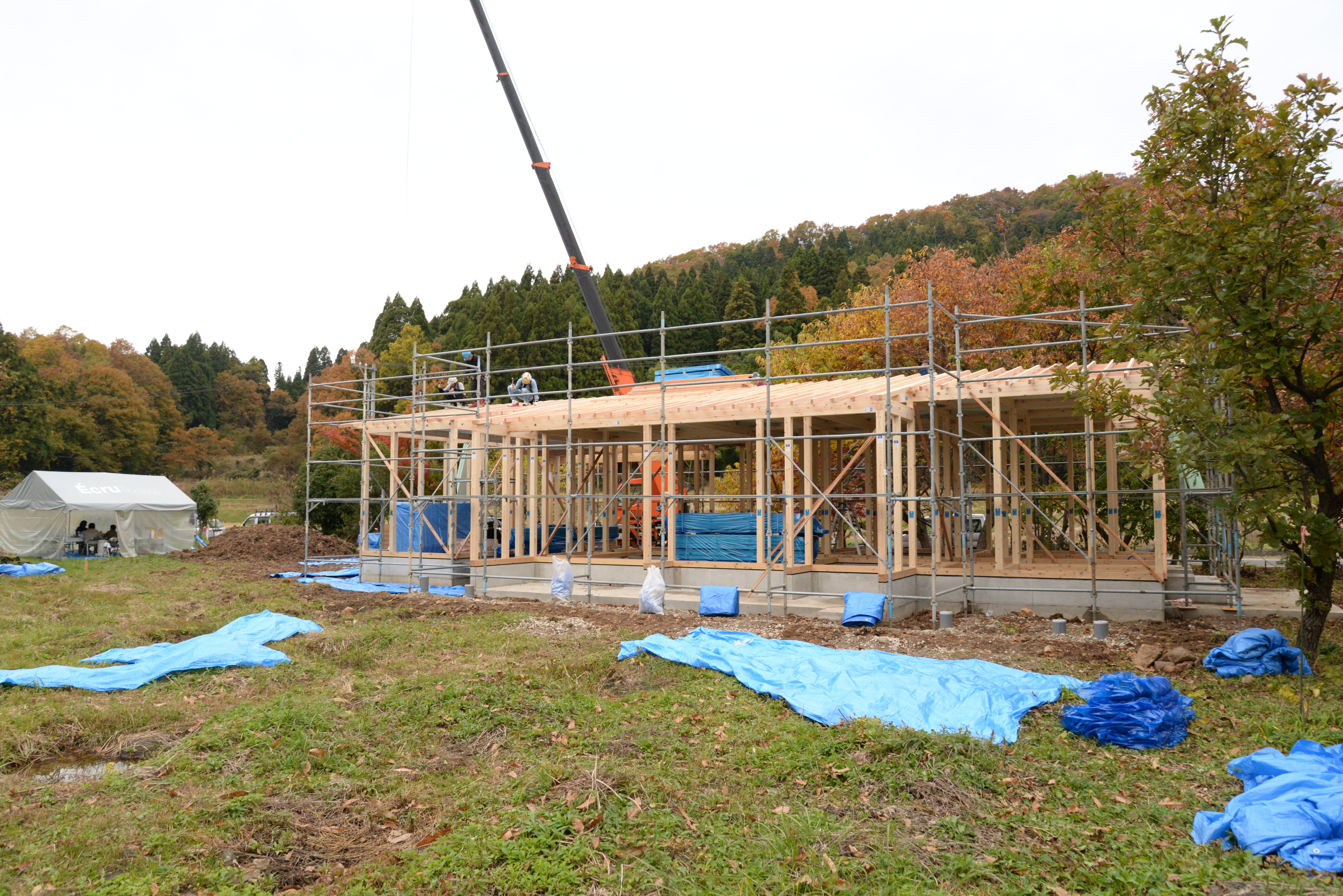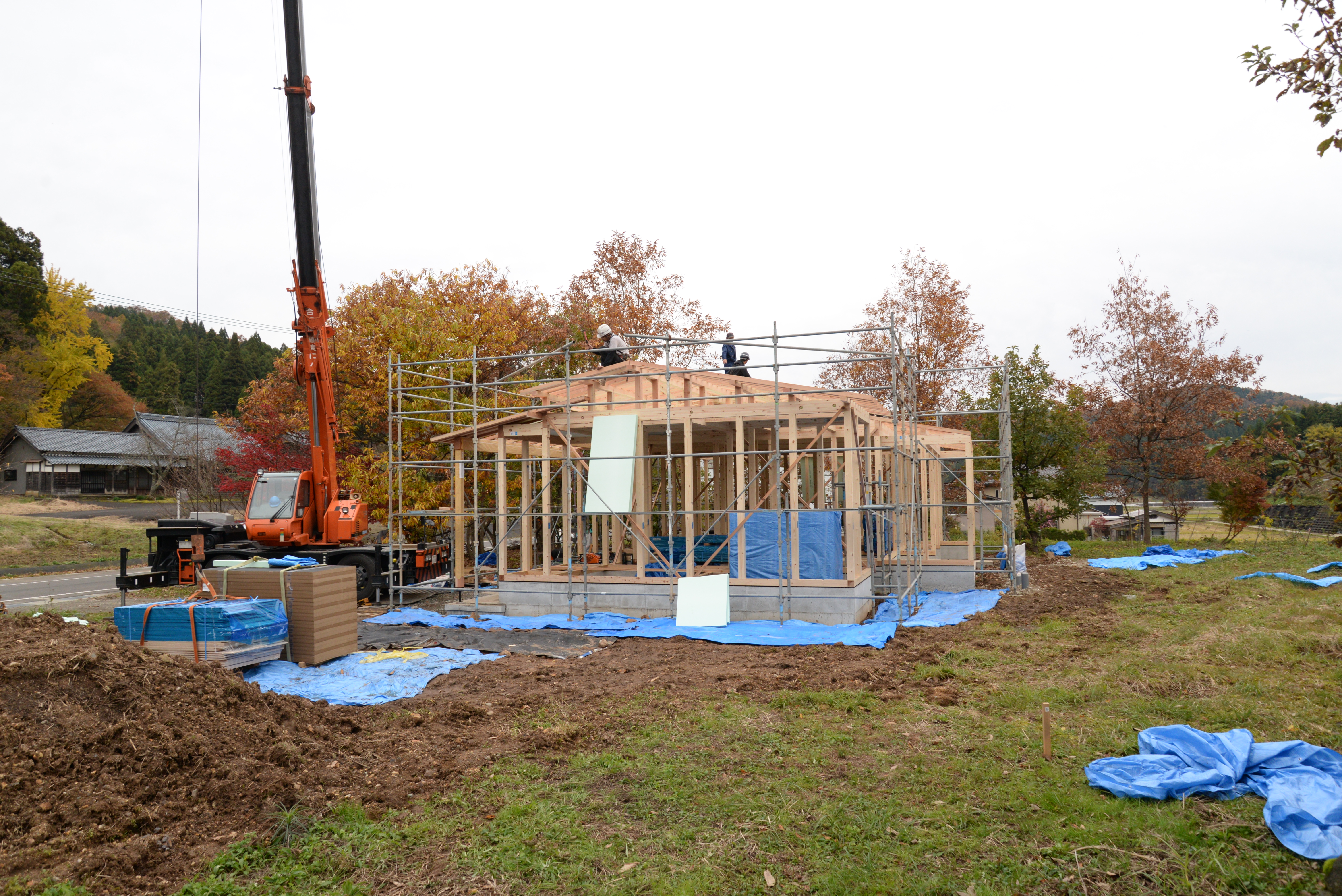 平屋の方が、屋根が広くて、屋根仕舞に時間を要して、建方が済む頃には、もう暗くなってしまいました。