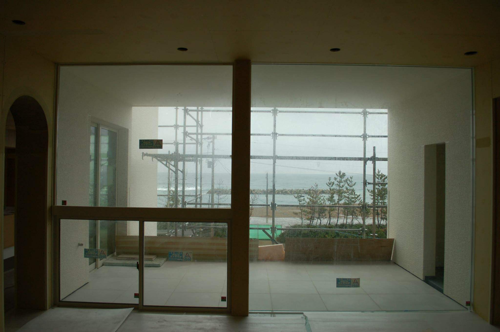 微妙に大きさが違ってしまった内外のタイルでしたが、その事を感じさせない、きれいに目地が中から外へと続く施工となっていました。