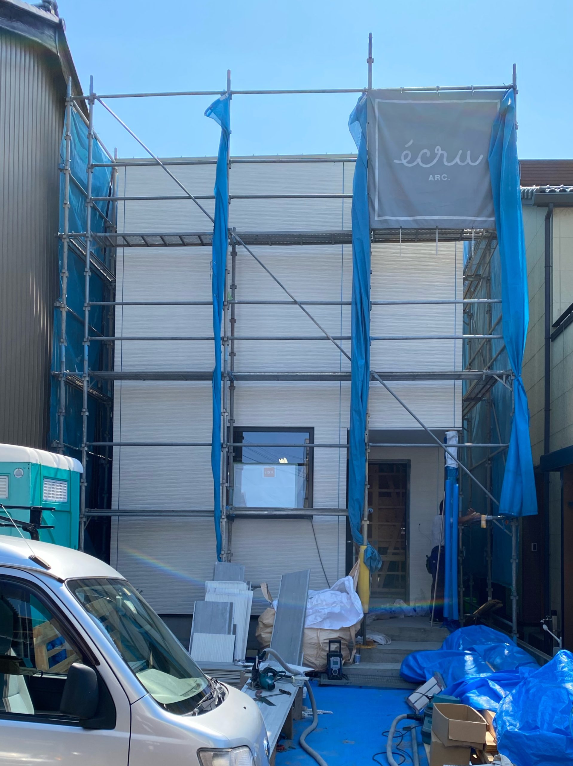 外壁をほぼ貼り終えた(仮称)春日2の家。