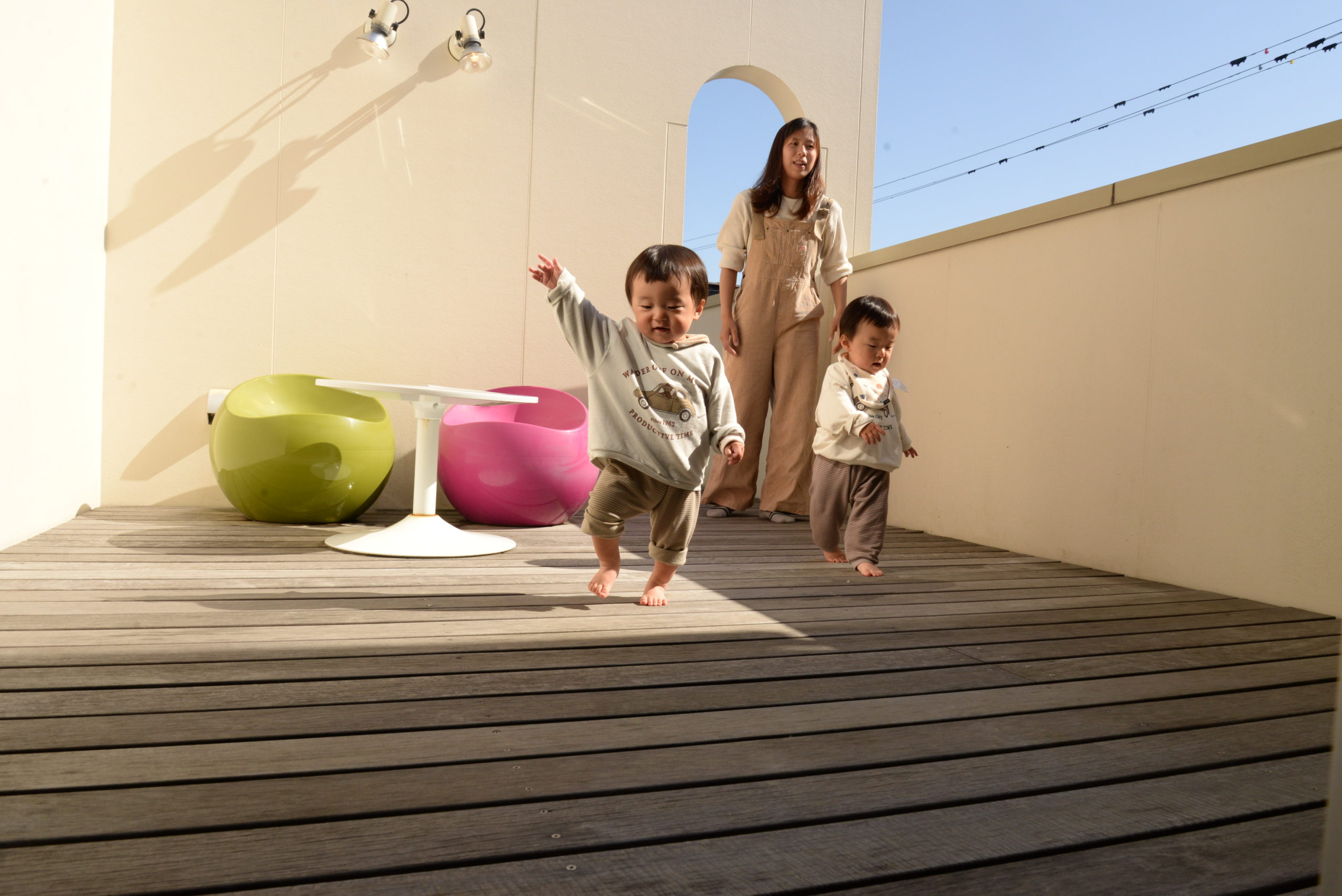 我が家のルーフテラスは、日頃は、足羽山をのぞみ、部屋を広く感じさせる広がりの演出する役割を担っていますが、この日は孫たちが外を感じたくてルーフテラスに出たがったので、日向ぼっこに一役かいました。