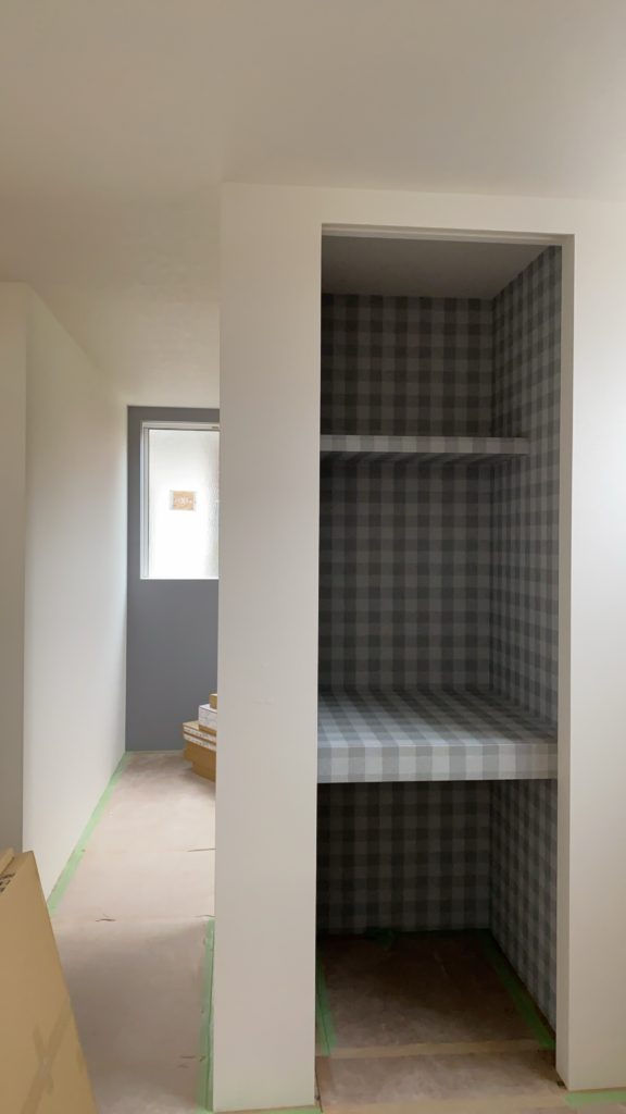 壁・天井のクロス工事が完了したので、次のタイル工事や住宅設備工事などの器具取付けに伴い、養生をしに行きました。