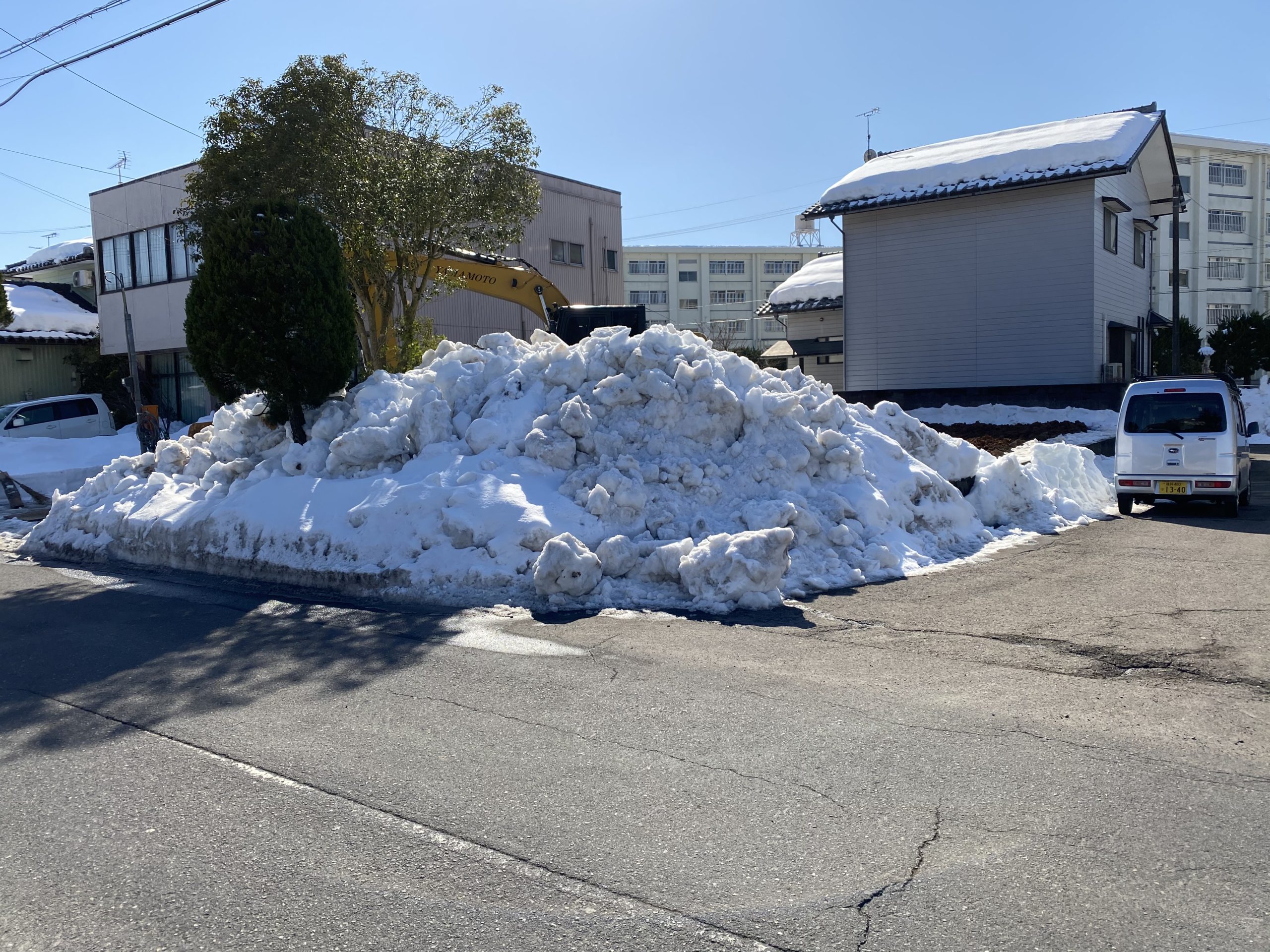 先日、仮設工事の為、(仮称)三十八社町の家の敷地を見に行った時は、角地で空き地だった為、道路を除雪した雪の山が敷地にまで入り込んでいて、工事に着手出来ない状況にショックを隠し切れませんでしたが、皆さまのおかげで、今日は地縄を張る事が出来ました。