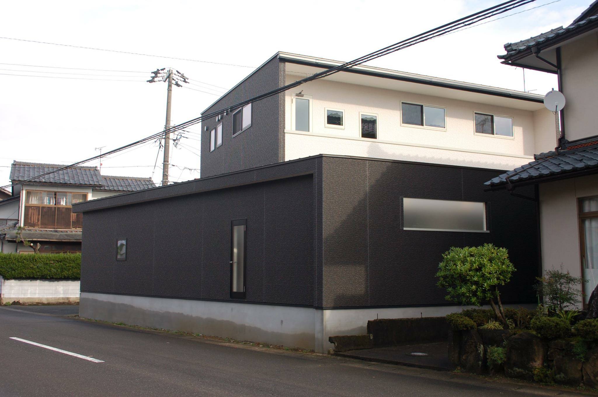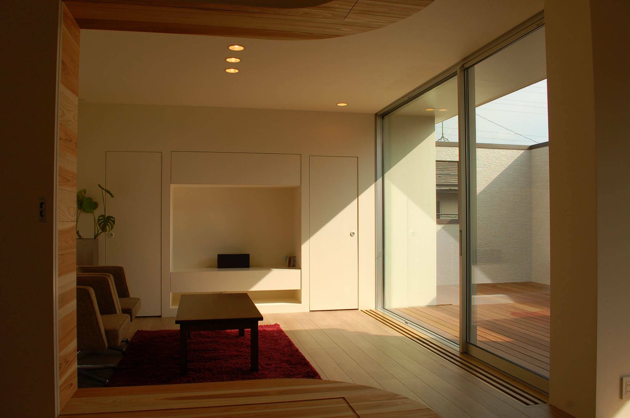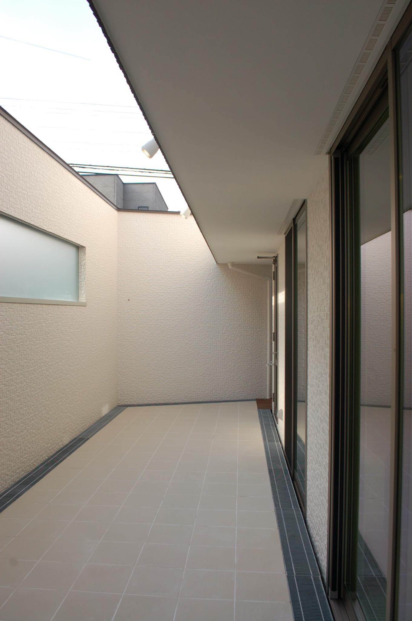 白い外壁部分は、南側からの直射日光の反射量を増やして、多くの光を下にありLDKに繋がるパティオ(中庭)をやわらかい光で満たす為です。