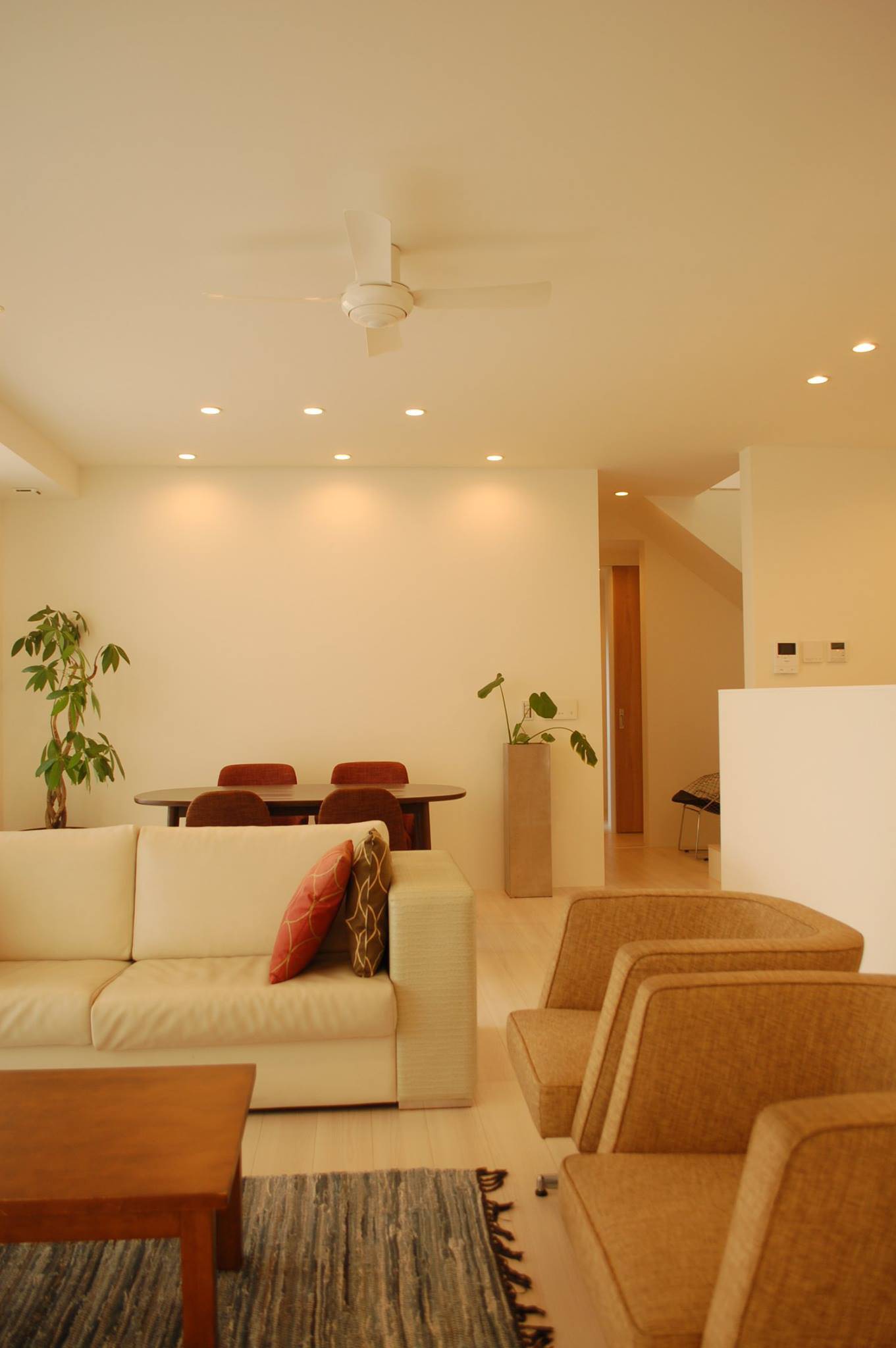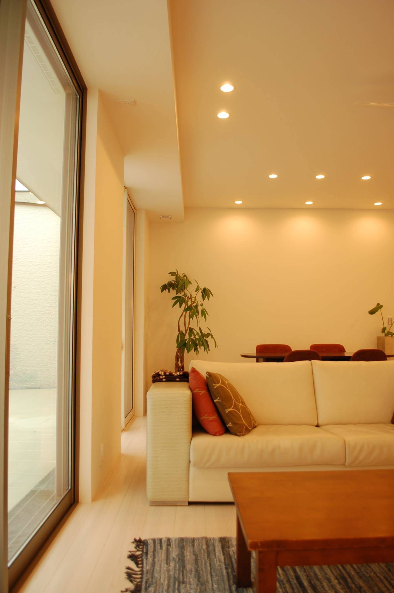 天空光に包まれた「伸遊の家」のLDKは、直射日光が入り込むLDKとは違い、明暗の差が少ない落ち着きのある空間になっています。