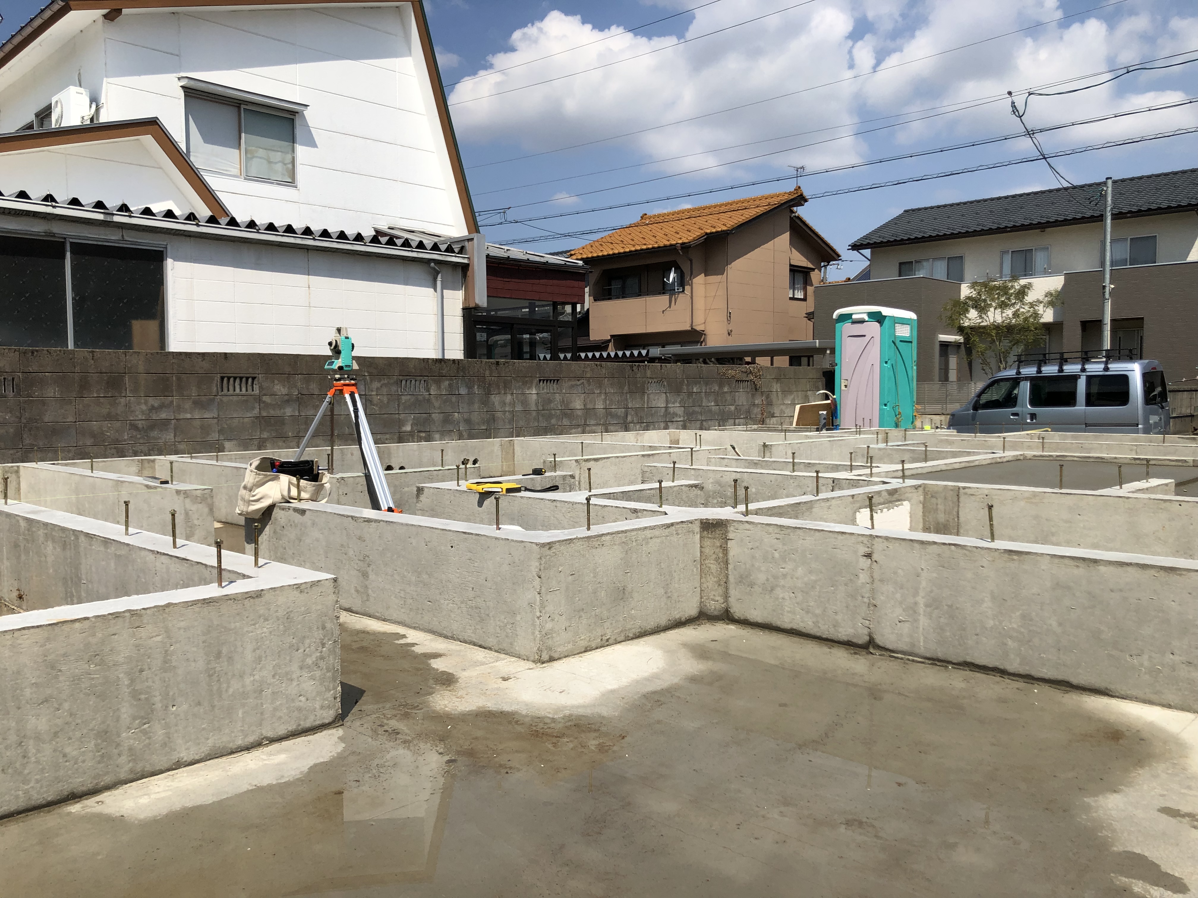 荒れた天気でしたが、久しぶりに今日は天気も良く、現場にてトランシットを使って墨出しを行いました。